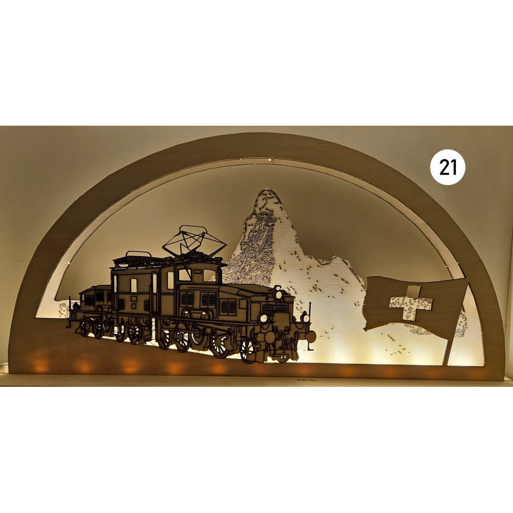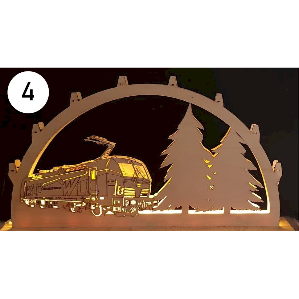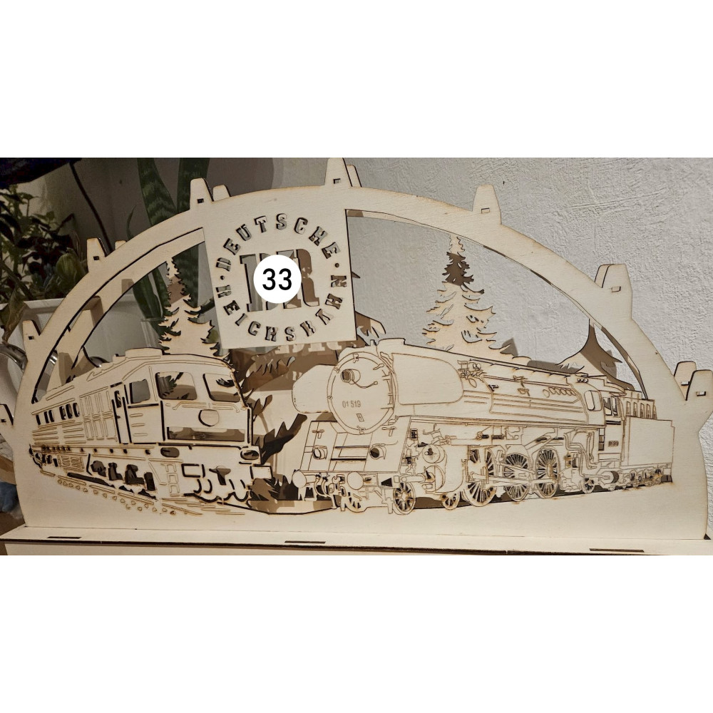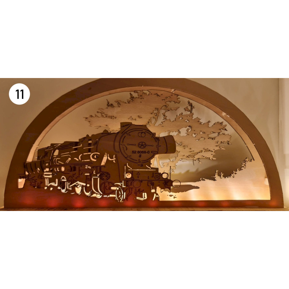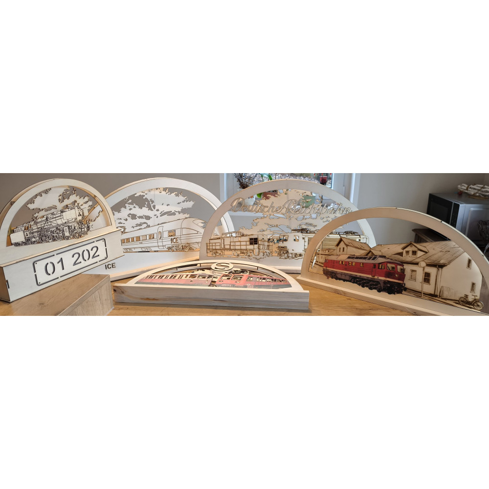 Bei uns erhalten Sie mittels Laser geschnittene und gravierte Schwibbögen mit Eisenbahn- oder andere Wunschmotive.