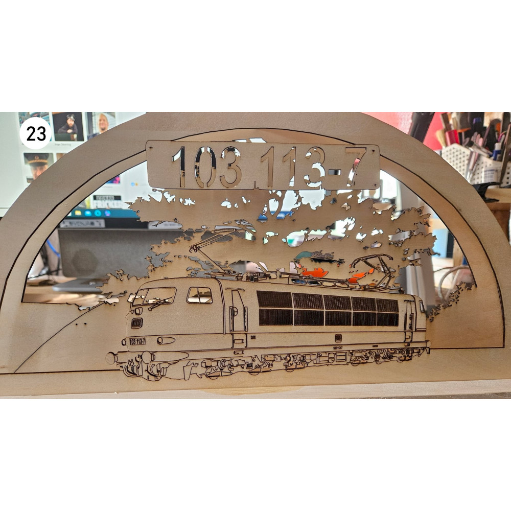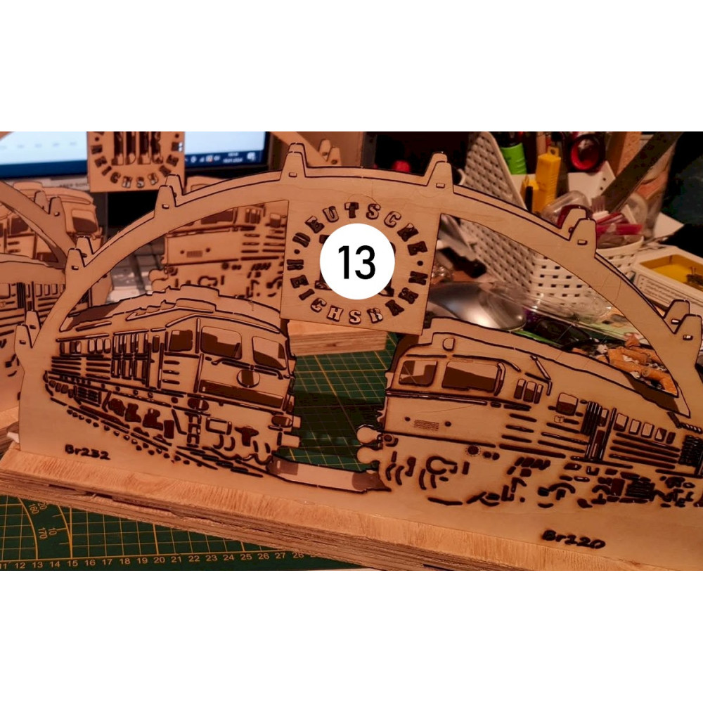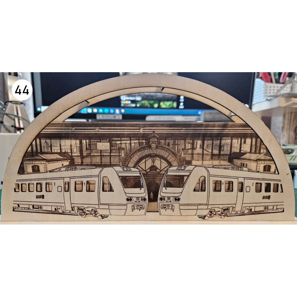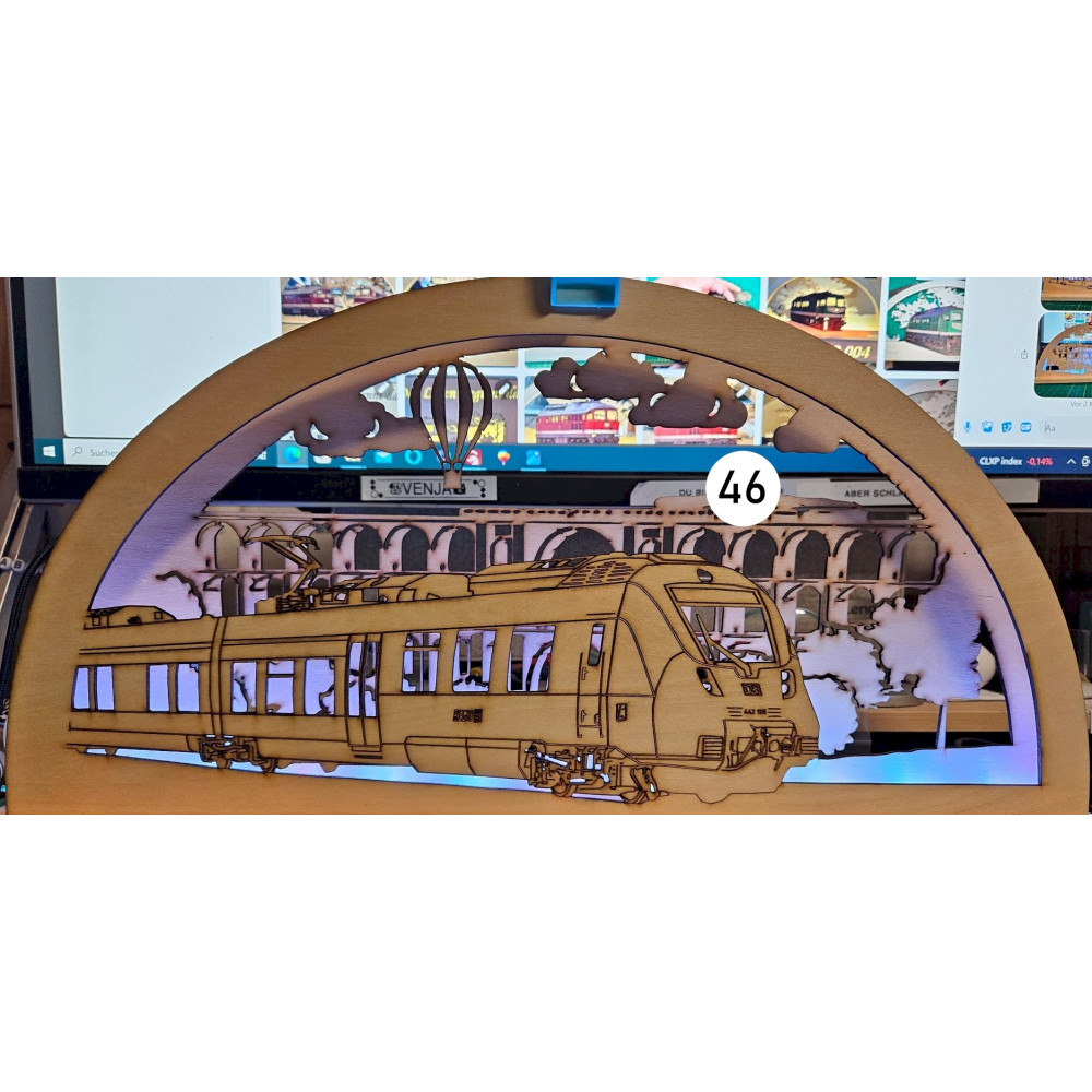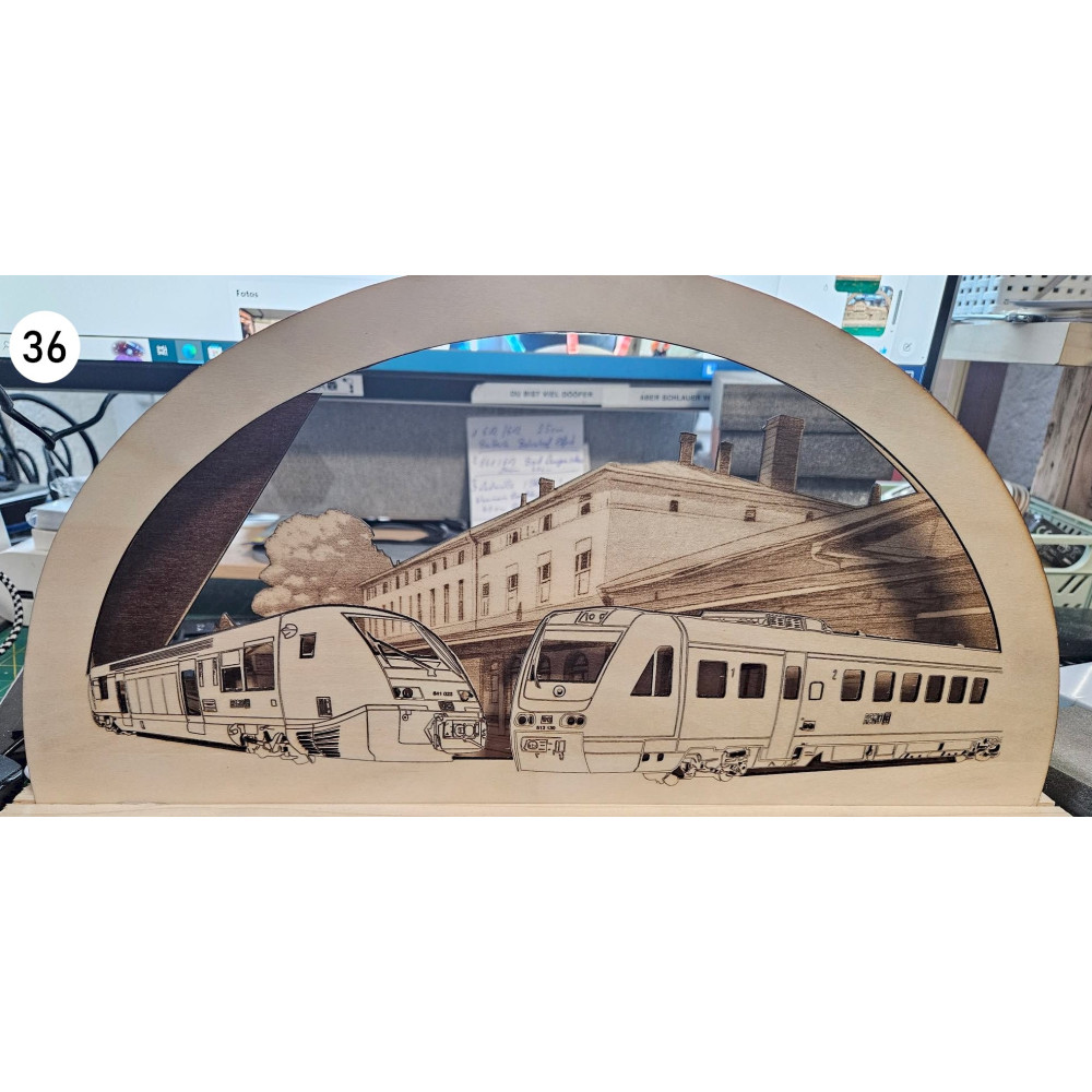 Bei uns erhalten Sie mittels Laser geschnittene und gravierte Schwibbögen mit Eisenbahn- oder andere Wunschmotive.